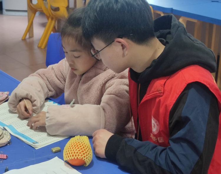 图为吴志磊在为“童心港湾”的小朋友解答寒假作业中的问题