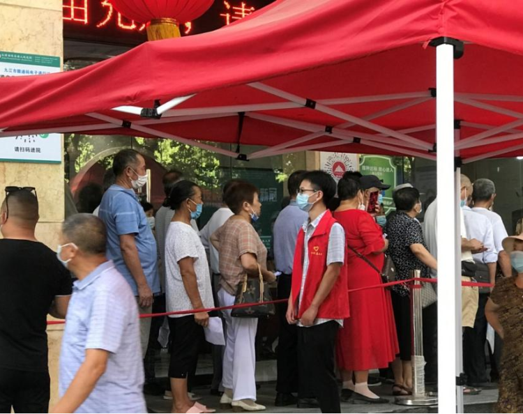 图为吴志磊正在德安县人民医院旁进行新冠疫苗接种志愿服务