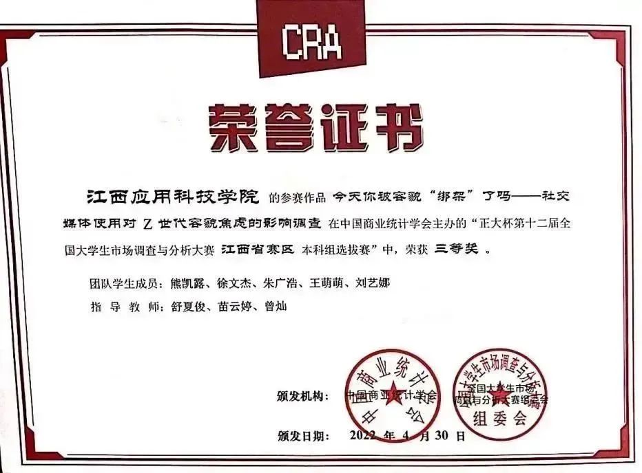2022年4月荣获全国大学生市场调查与分析大赛 省级三等奖;