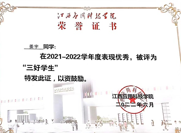 万丈高楼平地起,姜宇同学在思想上积极进取,在各方面严格要求自己,努力向党组织靠拢,在学习上认真刻苦成绩在班级上也名列前茅,工作上兢兢业业,对待工作一丝不苟,有着丰富的工作经验和创新的思维,得到了同学们的肯定和好评,生活上锐意进取,积极参加志愿活动和各种竞赛活动,并取得不错成绩。