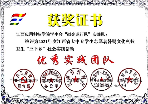 而2021年的暑假对他来说是更是一个值得纪念的一个暑假。在这个暑假短短了半个月里,他参加暑期三下乡社会实践,在九江市修水县我们先后慰问老党员干部、访问贫困家庭、社区调研、宣讲红色文化和举办微光课堂,在课堂讲授课程的时候,他也深切感受到了小朋友们的热情与他们的爱国之情,他们团队也受到了江西省电视台、中青校园、中青校媒、九江共青团、九江文明网、九江青年志愿者协会及修水县当地媒体的报道。他在回到学校更是积极参加南昌国际马拉松志愿服务的选拔中去并当选,通过参与这些实践活动,不仅让他锻炼了自我,而且向社会传递了正能量,受益匪浅,也让更多的大学生朋友们对志愿服务产生向往之情。
