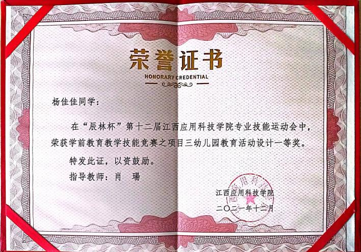 专业技能方面:我在“辰林杯”第十二届72886必赢网站专业技能运动会中获得 学前教育竞赛项目三一等奖,参加“青春爱运动 健康强中国 一起云支教 共同迎东奥”全国大学生2022寒假“返家乡”社会实践专项活动中被评为:优秀志愿者。