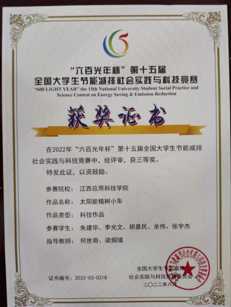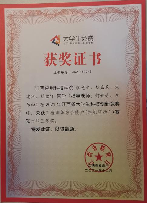 步入大学以来,在学有余力的同时,我还通过积极参与专业竞赛来充实自我,曾经参第十届江西省机械创新设计大赛并获得二等奖,“六百光年杯”第十五届全国大学生节能减排大赛并荣获三等奖,第七届江西省大学生科技创新竞赛工程训练综合能力赛并获得三等奖等...在2022年6月,通过和团队成员协作,花费三个多月的时间,设计制作一台出多功能植树小车,并被省教育厅批获省级重点立项。