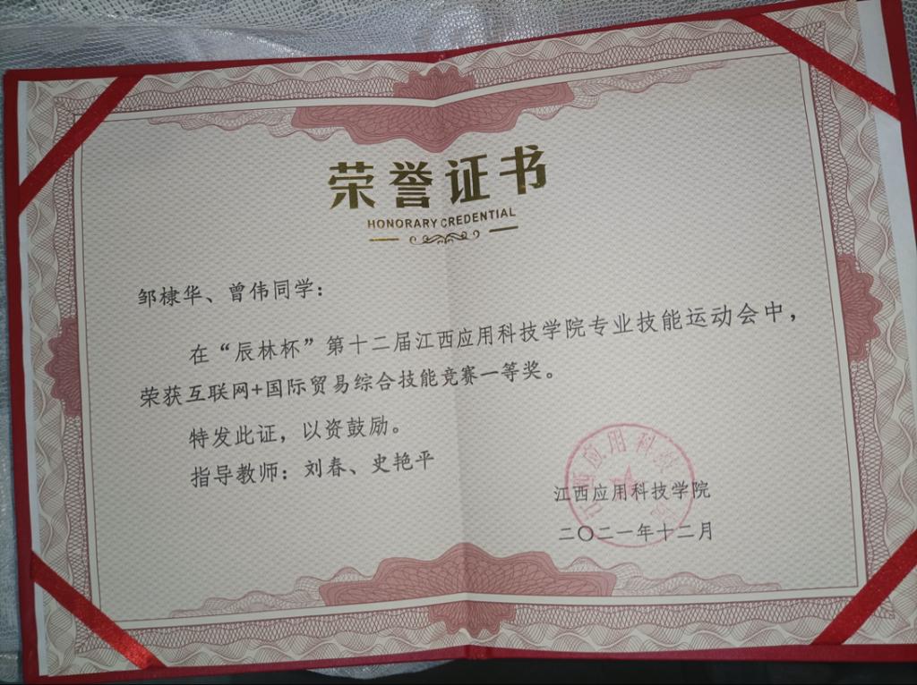 3.2021年11月获得互联网+国际贸易综合技能竞赛校赛一等奖 (校级)