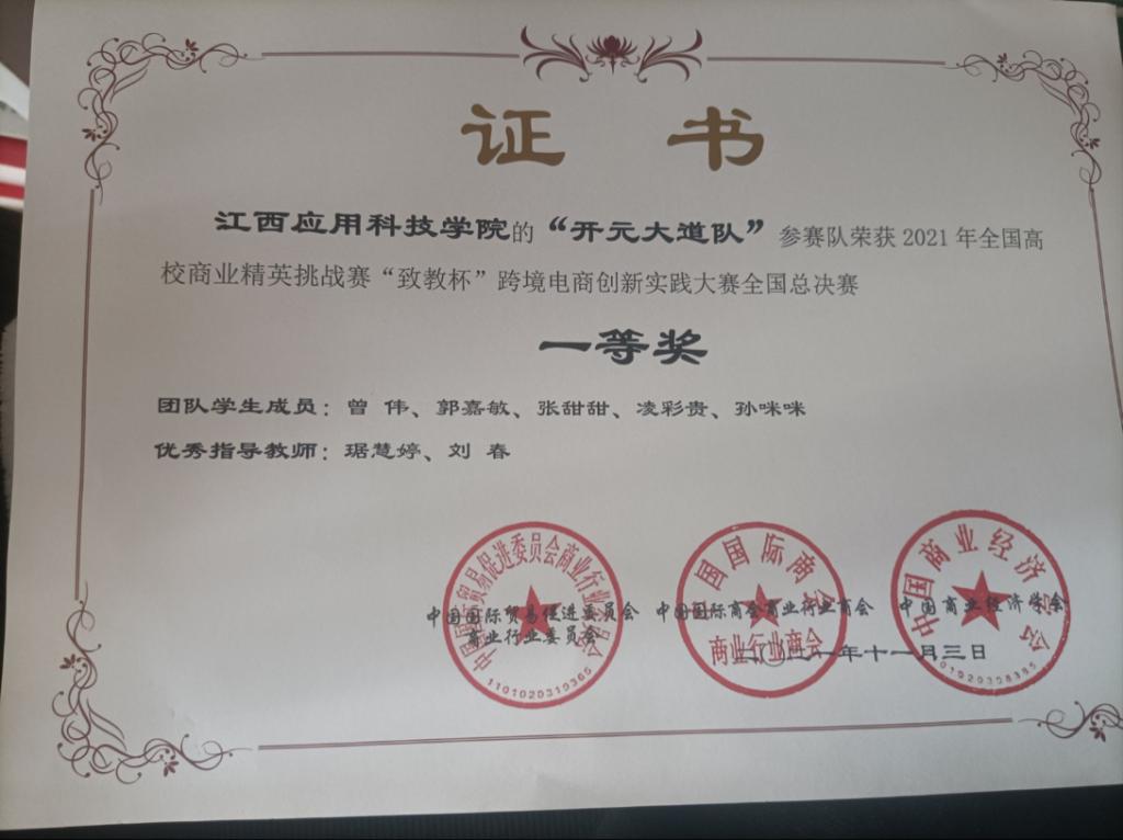 1.2021年11月获得“致教杯”跨境电商创新实践大赛全国总决赛一等奖(国家级)