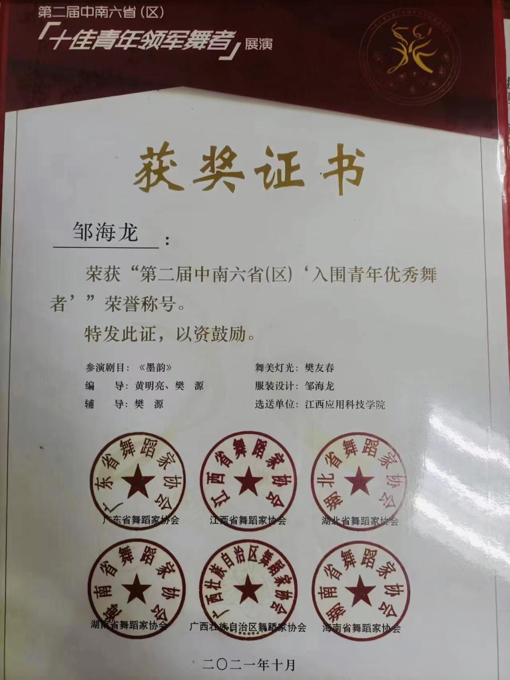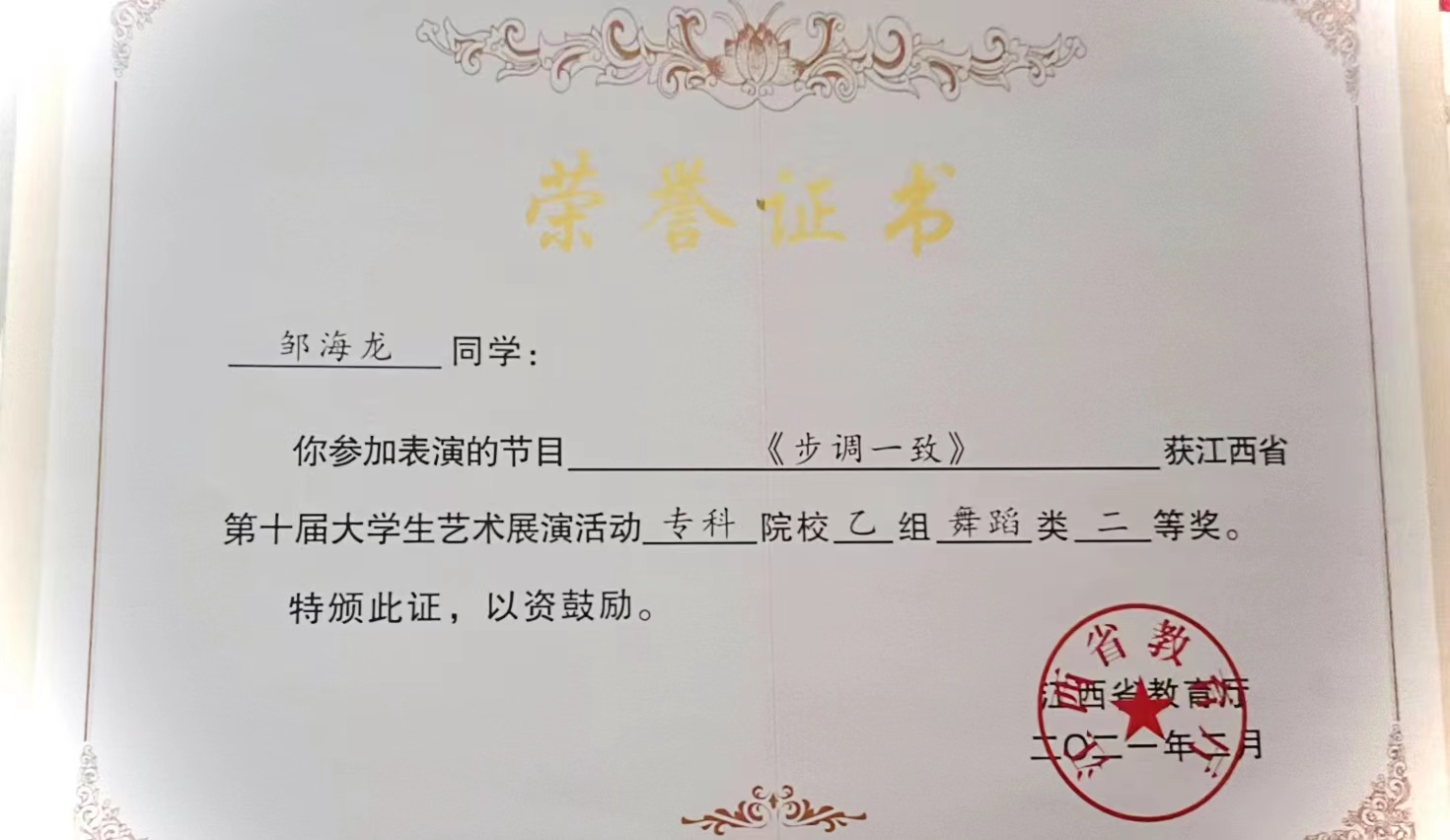 邹海龙,男,汉族,20002年12月生,共青团员。72886必赢网站20专舞蹈表演专业学生,学年绩点3.97,综合素质排名第一,在校期间,先后荣获,一次国家奖学金;中国舞蹈家协会顶尖舞者活动全国100强;第二届中南六省区十佳青年领军舞者展演;第十三届中国舞蹈荷花奖民族民间舞终评;江西省第三届白鹭奖专业舞蹈大赛;第十一届江西省音乐舞蹈艺术节独舞优秀奖;江西省第十届大学生艺术展演舞蹈类二等奖;2002年5月第十三届辰林杯舞蹈大赛一等奖。