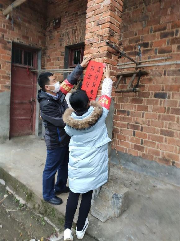 瞿振东、李雅琴夫妇在村口张贴防疫宣传标语