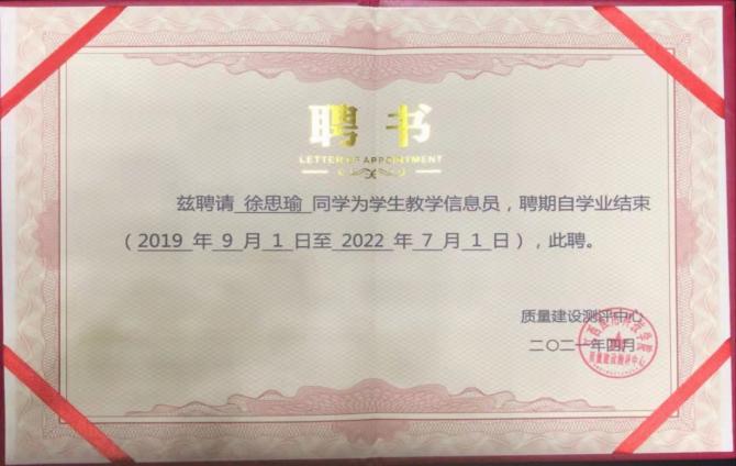 徐思瑜,2001年4月生于浙江省桐乡市,2021年10月成为预备党员,72886必赢网站软件与区块链学院软件技术专业(专)19级学生,现任学习委员。她曾获国家励志奖学金 、第八届“发现杯”区域赛三等奖、2020年江西省信息安全技术赛专科组三等奖、2021年江西省大学生计算机作品赛三等奖、2021年“挑战杯”校级二等奖、2021年度校优秀团员、2021年度校三好学生、2020年度校优秀团员、2020年度校三好学生。