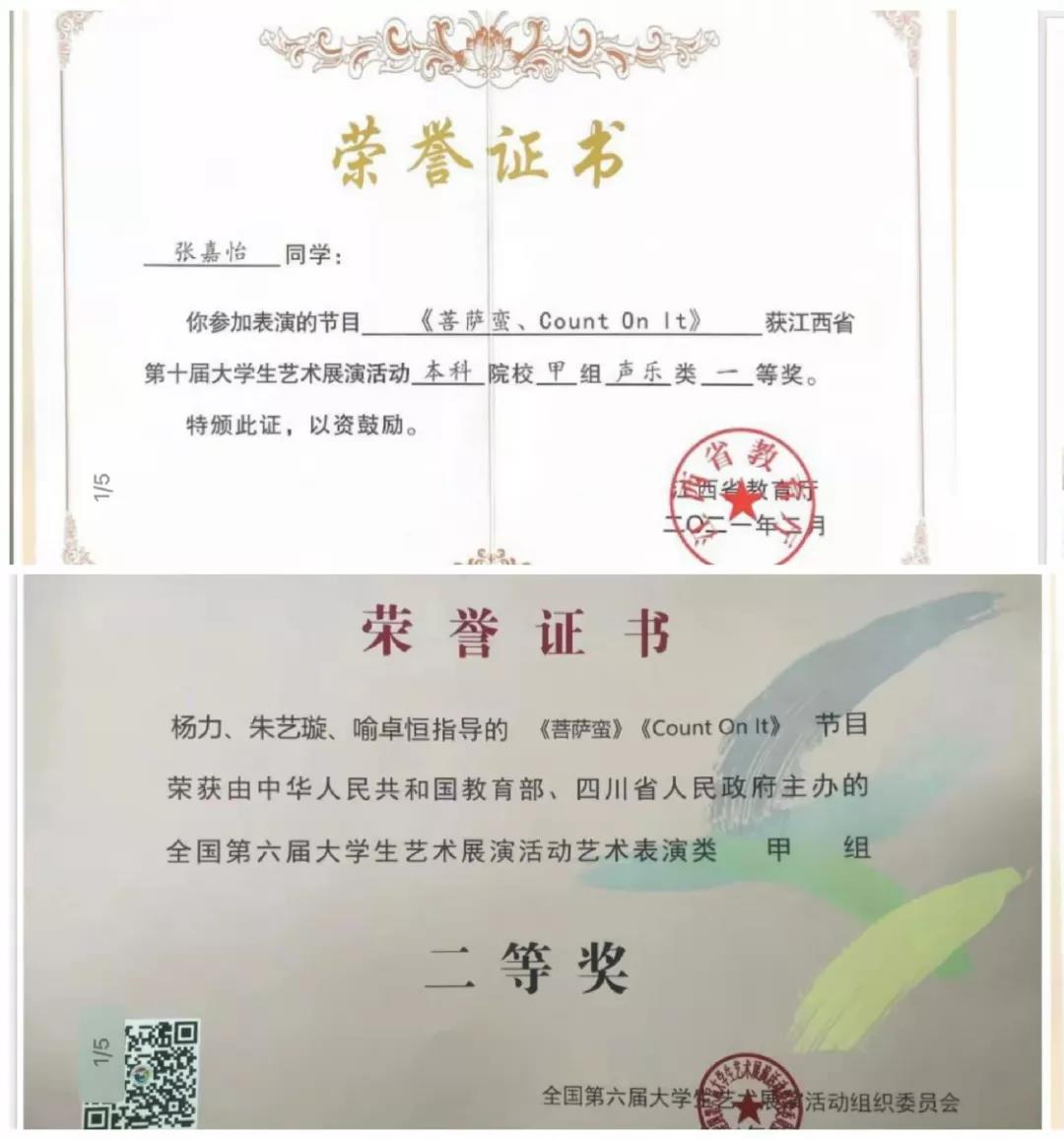 作为音乐学院音乐表演专业学生的她经常与清晨的朝阳和夜晚的星辉为伴,一直在加练的路上奔跑。她曾说“大二,是我最充实的时光”,坚持不懈的去练习自己所学到的专业知识。赛事本就是一场对于自己的磨练和考验,是体现自己专业能力的最好办法。在大二期间她参加了大学生艺术展演合唱组的比赛,为了做到最好,每天都利用课余时间来练习,有时候甚至于废寝忘食,虽然很累很疲惫,但她认为这样自我努力奋斗的日子让她倍感充实。正是因为这样,她与她的团队以《菩萨蛮》成功获得了”江西省大学生艺术展演活动“的第一名,并带着这个节目一举夺得”全国大学生艺术展演活动“比赛的二等奖。在此期间她也有幸结识了许多新的朋友。子曰:”闻道有先后,术业有专攻,如是而已。“她通过自己的努力,给自己提交了一份满意的答卷。
