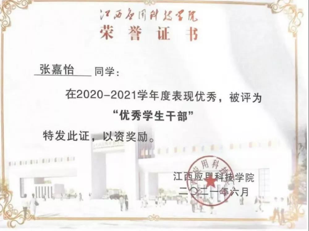 身为班级委员的她在工作中,认真负责,兢兢业业。无时无刻都在想如何更好的管理好班级,为老师分担压力,为同学谋划福利。在此过程中她自己也在不断的要求自我,希望能够给班级的同学树立一个好的榜样,进而提高班级的学习氛围。在工作交流时她也会积极发言,说出自己的想法,为班级的建设添砖加瓦。无论是学习还是工作,她都会”带头冲锋“。因此,在2020-2021学年被评为”优秀班干部”。