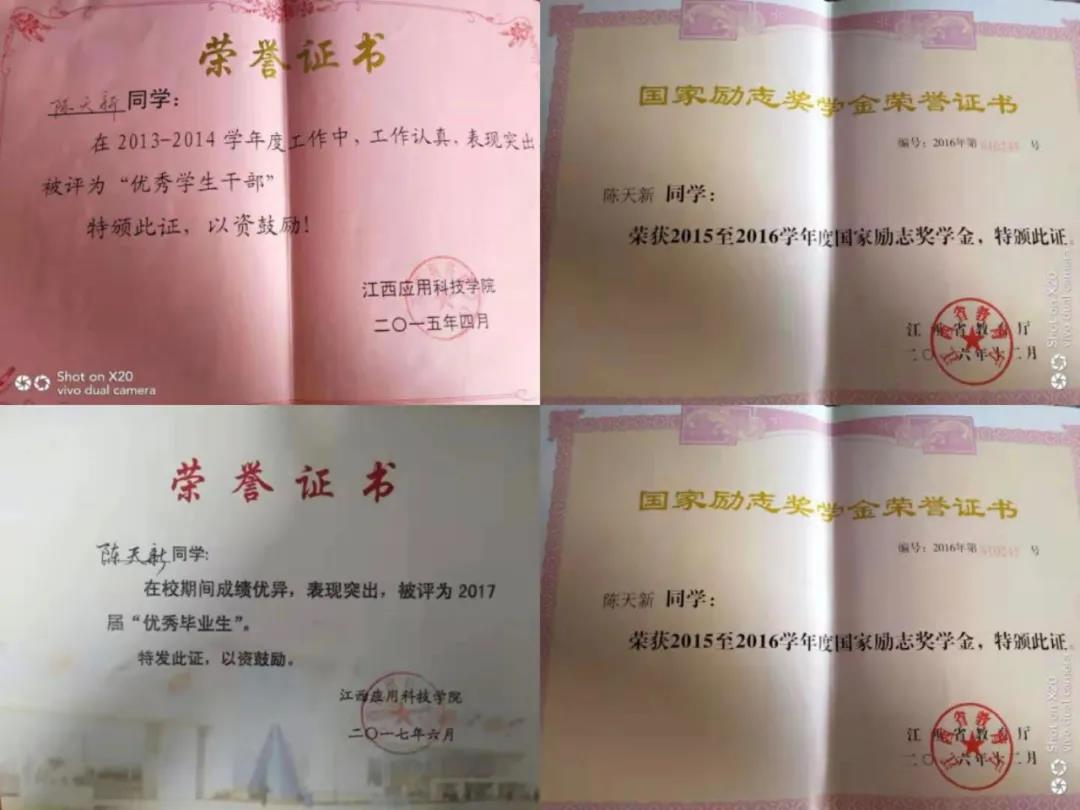 陈天新在校期间表现突出,2016年10月他正式成为一名共产党员,多年的愿望终于实现,但他却没有有过多的欣喜,他深知自己距离一名优秀的共产党员还有很远的差距,只有不断地学习,不断地充实自己,踏踏实实地学习工作,才能早日成为一名优秀的共产党员。