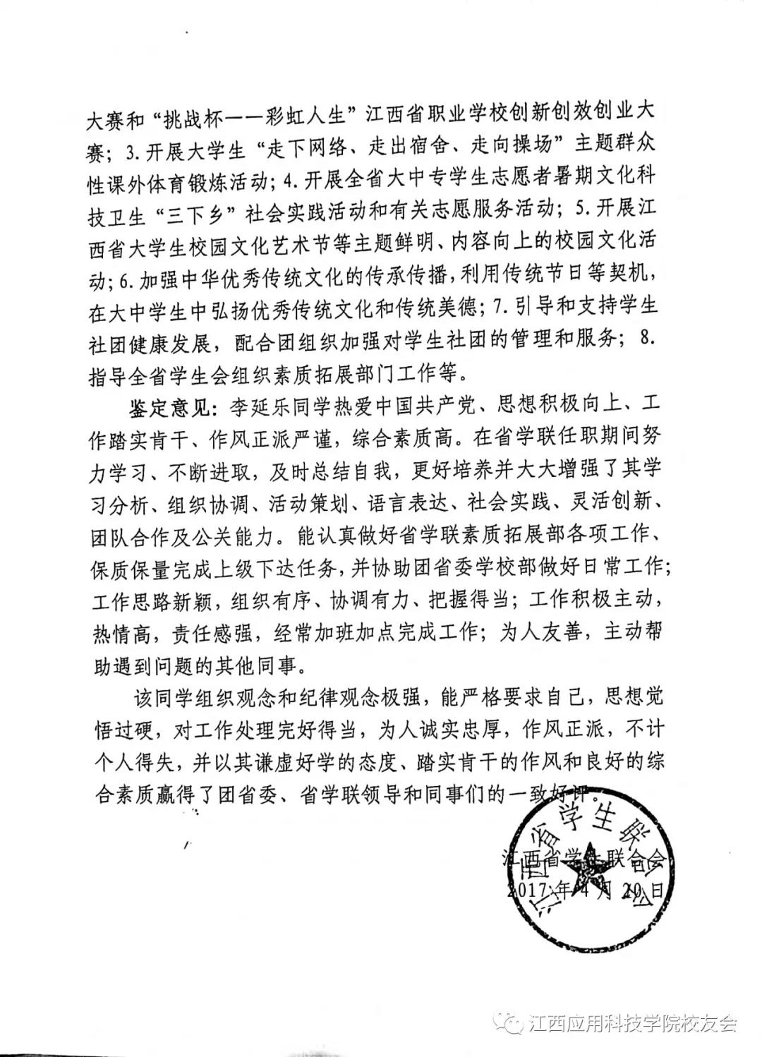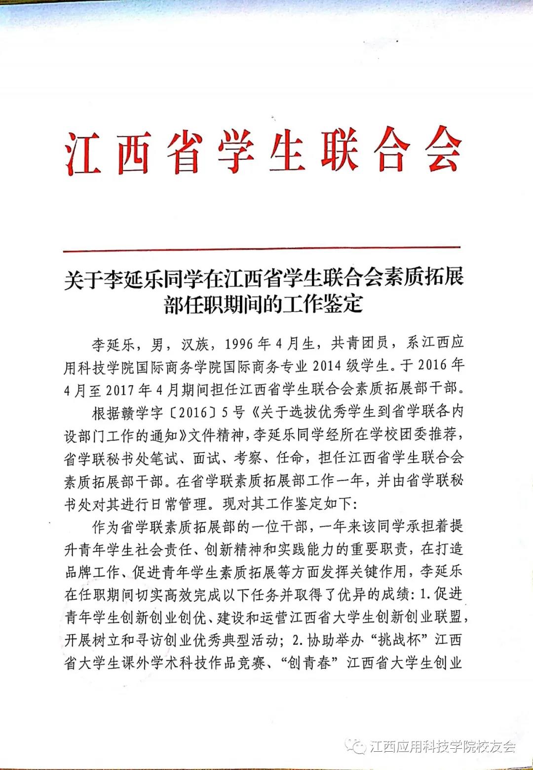 ▲李延乐任职江西省学生联合会的工作鉴定