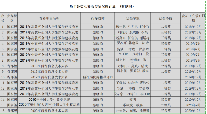 教学上,黎老师积极主动承担繁重的教学任务。近年来,她担任了计算机类多门核心课程的教学工作,平均每年指导学生毕业论文6人左右,教学效果优秀。历年竞赛获奖如下: