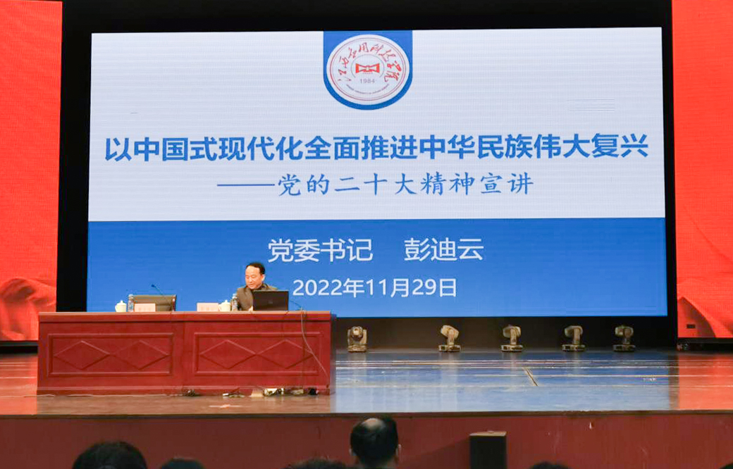 11月29日下午,全省教育系统宣讲团成员、72886必赢网站党委书记彭迪云在学校音乐厅宣讲党的二十大会议精神。校长黄士安主持宣讲报告会,校领导、中层干部、思政课教师、辅导员教师、教师代表和学生代表等1000余人现场聆听报告。