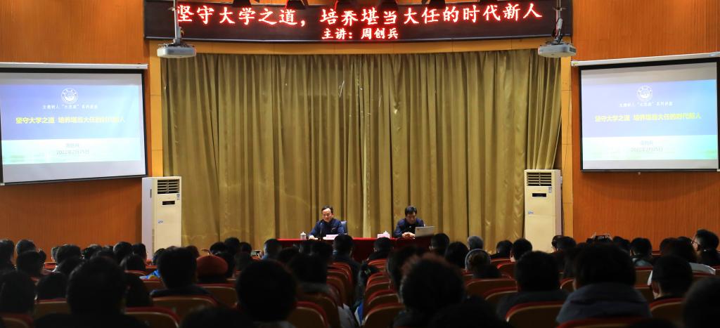 报告会上,周创兵校长深刻剖析了大学的本质特征、立德树人的内涵和当代大学生成长成才之路。他指出,现代大学发展关键是要回归大学本位、做好育人本分、追求教育本真、坚守办学本心、永葆学术本色,不忘办学初心,牢记育人使命,全面贯彻习近平新时代中国特色社会主义思想,找准办学定位和发展方向,建立健全知识体系、逻辑体系、话语体系,培养政治认同正确、家国情怀深厚、社会责任强烈、文化自信坚定、人格修为健全,德智体美劳全面发展的人。他说,大学的本质特征是学生、学者、学术、学科、学风等要素组成的命运与共学术共同体,师生水平高则学校水平高,学术影响大则学校影响大,学科专业强则学校强,学风好则学校发展好。