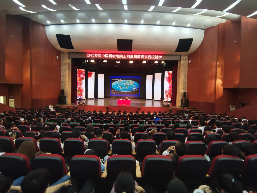 刘嘉麒院士首先从地球的组成、地球的演变、地球的陆地与海洋以及地球的历史等多个方面向学生们科普了许多地球知识。他由“地球是人类赖以生存的家园,人类需要的一切几乎都依赖于地球,地球的气候变化也影响着整个自然界以及人类社会。”引出了地球科学这一概念,并强调了地球以及地球科学的重要性。在谈到什么是地球科学时,刘院士指出地球科学就是养护人类的科学,地球科学旨在探索自然奥秘,推动社会的发展与进步,为人类谋福祉。社会建设的各项重大工程都离不开地球科学作为支撑,地球科学集现代科学技术之大成。例如中国的“青藏铁路”、“西气东输”、“南水北调”、“三峡工程”这些工程的选址以及基础建设也都要用到地球科学的相关知识。