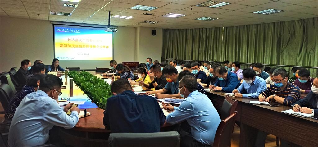 3月14日下午,学校在综合楼六楼会议室中召开传达落实全省教育系统新冠肺炎疫情防控工作视频调度会精神会议,学校疫情防控工作领导小组全体成员,校属各单位主要负责人参加会议。会上,校长黄士安要求学校防疫工作领导小组要统一领导,领导班子各司其职,自觉担起责任,疫情防控办抓好日常管理,全校广大干部师生要高度重视,精细、精心、精准做好防疫工作。