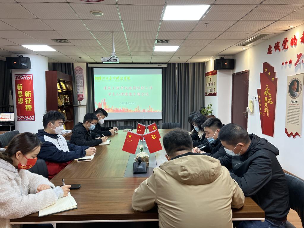 为进一步加强疫情防控期间学生心理健康教育工作,2022年3月20日上午10时,建筑工程学院在综合大楼303室召开疫情防控期间学生心理健康教育工作专题会议。本次会议由学院党总支副书记刘伯川主持,学工科长许永飞及学院全体辅导员参加此次会议。