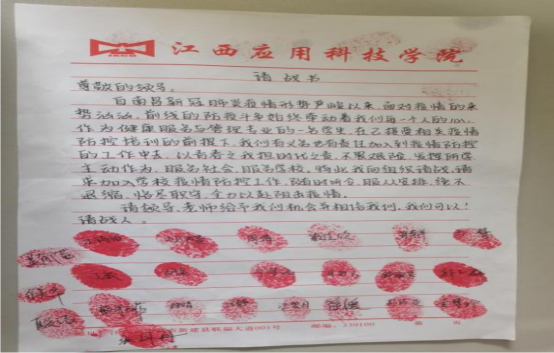 请战书中写到:“自南昌新冠肺炎疫情形势严峻,来势汹汹,前线的抗疫斗争始终牵动着我们每一个人的心。作为健康服务与管理专业的一名学生,在防控培训的前提下,我们有义务也有责任参与到疫情防控的工作中去。以青春之我,担时代之责,不畏惧,主动作为,服务社会、服务学校。”