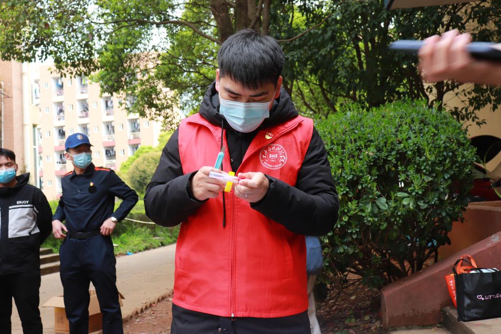 “提前打开昌通码、戴好口罩,间隔一米距离,有序做核酸检测啦!”辅导员杨江龙积极带领学生党员突击队及志愿者积极开展核酸检测前的各项准备工作。宣传小分队以微信群发、流动小喇叭、打电话等方式,通知各楼栋学生有序进行核酸检测,一直持续到了晚上近十点。23日一早来到检测点做好后勤服务工作,志愿者提前对检测点及周边道路实行全面消杀,在现场维持秩序,查看昌通码,引导学生间隔一米依次做核酸。