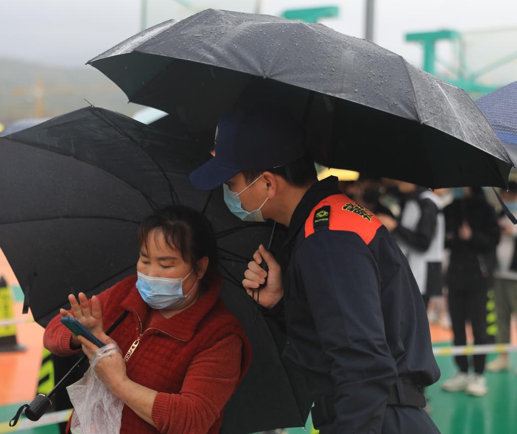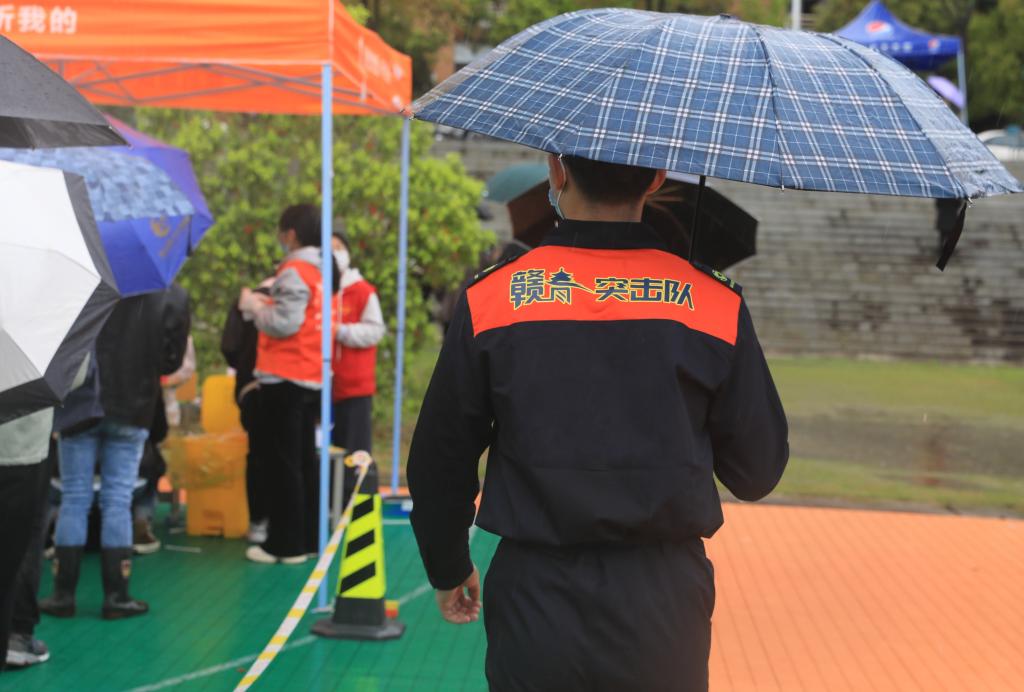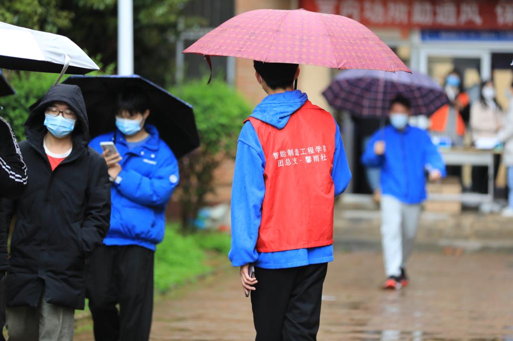 大雨阻挡不了工作人员们的坚守,也无法泯灭全校师生的团结之心。核酸检测的过程中,各分院负责各楼栋的秩序维持,每栋楼也配备了一名青年突击队队员和两名教官队队员协助维持秩序,学生下楼检测采取按楼层为单位,十人一组。排队、扫码、检测,暴雨中的核酸检测依旧秩序井然。