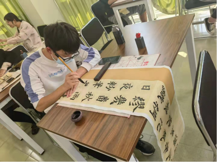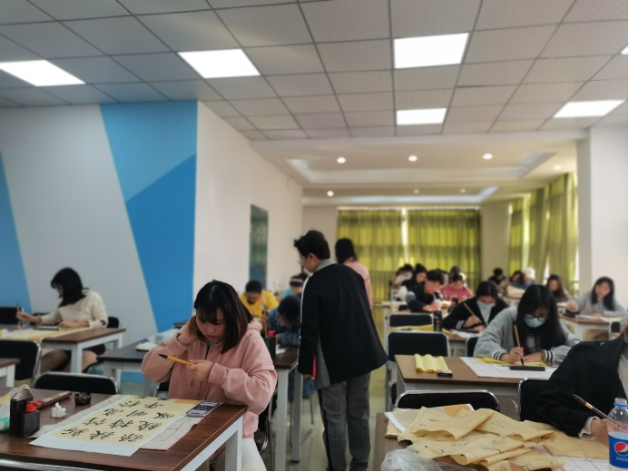 决赛现场,参赛选手书写着各种字体,行书,楷书,草书等。有的苍劲有力,有的雄健洒脱,行云流水,有的秀气灵巧。书法与学生的性格很好的进行了契合。