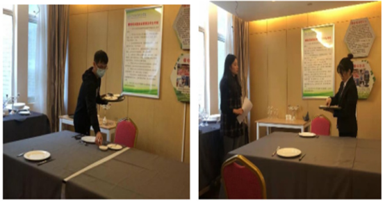 比赛过程中,评委老师仔细观察选手们的礼仪、摆台情况以及摆台姿势的标准程度来进行打分。