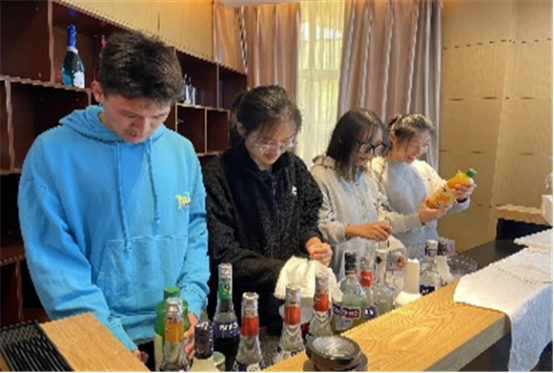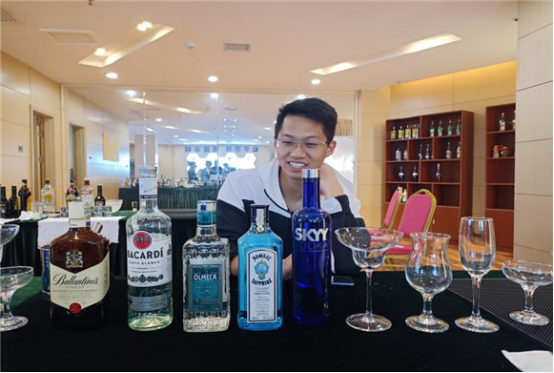 现代管理学院党支部书记刘国平也来到了比赛现场,来观看比赛状况,和学生们一起认识酒,观看学生调酒的过程,还喝了一杯学生比赛现场调制的鸡尾酒,表示味道不错,挺好喝。