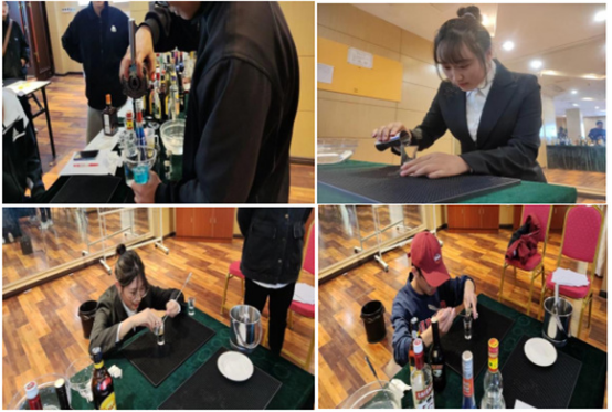 比赛如火如荼的进行中,在比赛过程中,评委老师仔细观察选手们的礼仪、调酒姿势以及鸡尾酒作品进行打分。
