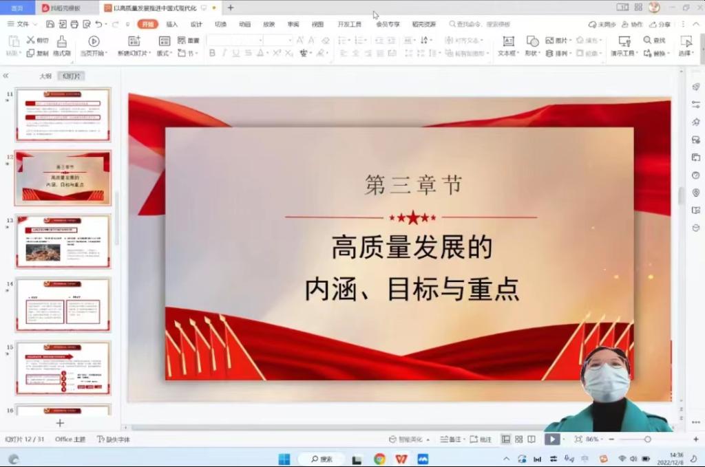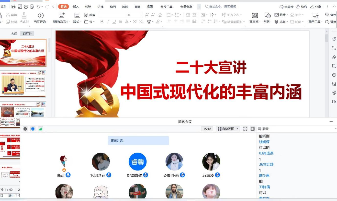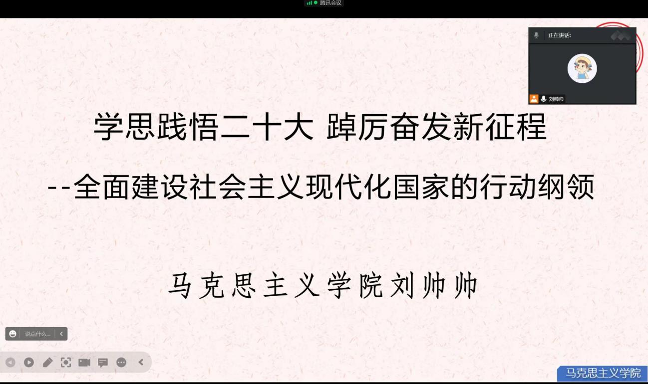 为让高校大学生深入地理解党的二十大精神,自觉地树立高尚的人生追求,勇担民族复兴的大任。自2022年12月14日开始,马克思主义学院开展了党的二十大精神的宣讲活动。本次宣讲活动主要面向的是22级和21级的学生,马克思主义学院党支部安排了五位优秀青年教师,分别在不同的班级进行线上宣讲。