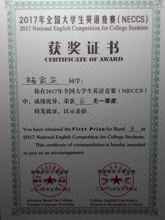 其中,必赢官网文化与旅游学院的褚家庆和姜桓静同学分获B类(英语类本科专业)一、二等奖;鲁宽、曾雨锌、龚浩、曾晨、余碧珍等同学分获C类(非英语类本科专业)二等奖;姜虹同学获C类(非英语类本科专业)三等奖;徐文娟、朱渴同学分获D类(非英语类专科专业和艺术体育类本科专业)二、三等奖。