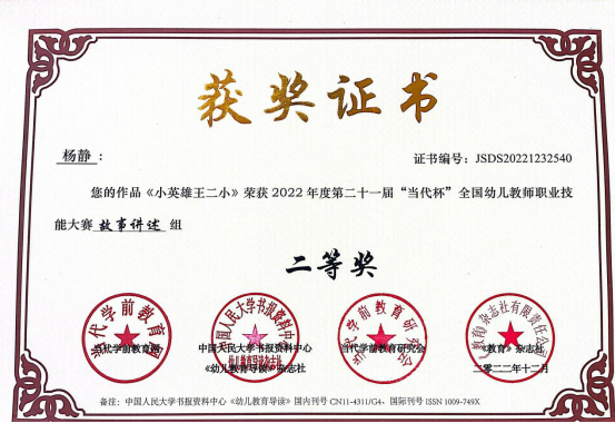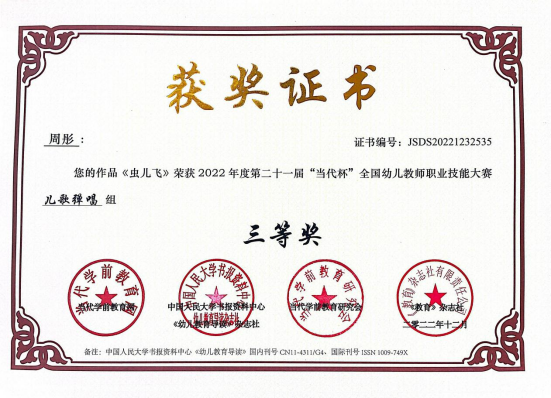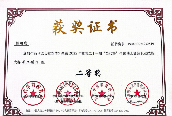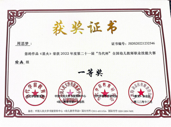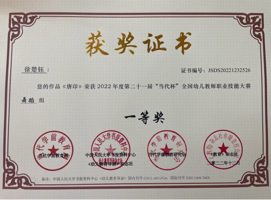 此次大赛以“创新,源于对教育的感悟”为主题,由教育部主管、中国幼教核心期刊《幼儿教育导读》杂志社和当代学前教育网主办,是一项大型高水平全国学前教育专业赛事。参赛学生在老师的悉心指导下积极备赛,参赛作品涵盖教案、教育随笔、观察记录、案例分析、活动方案、论文、玩教具制作、环境创设、手工艺术、绘画等十余个种类。作品主题鲜明、种类丰富、教育性强,注重过程的展示,体现了知识的整合性。最终,共有29个参赛作品获奖,其中,一等奖6项、二等奖12项、三等奖8项、优秀奖3项,学院朱小媚、闫婷等三位老师荣获“全国促进幼儿教师专业化最佳指导奖”。