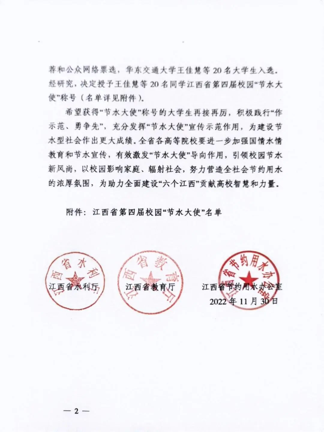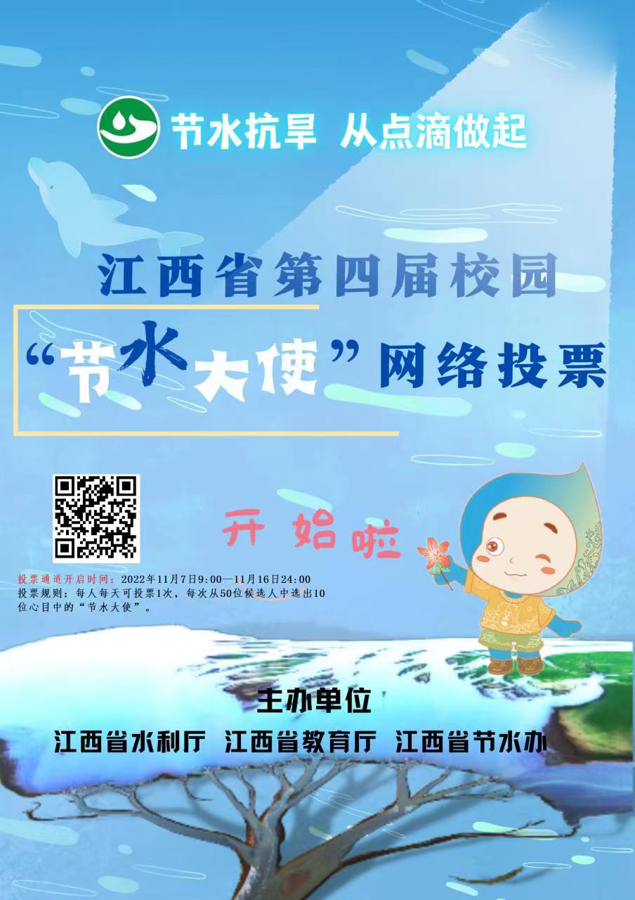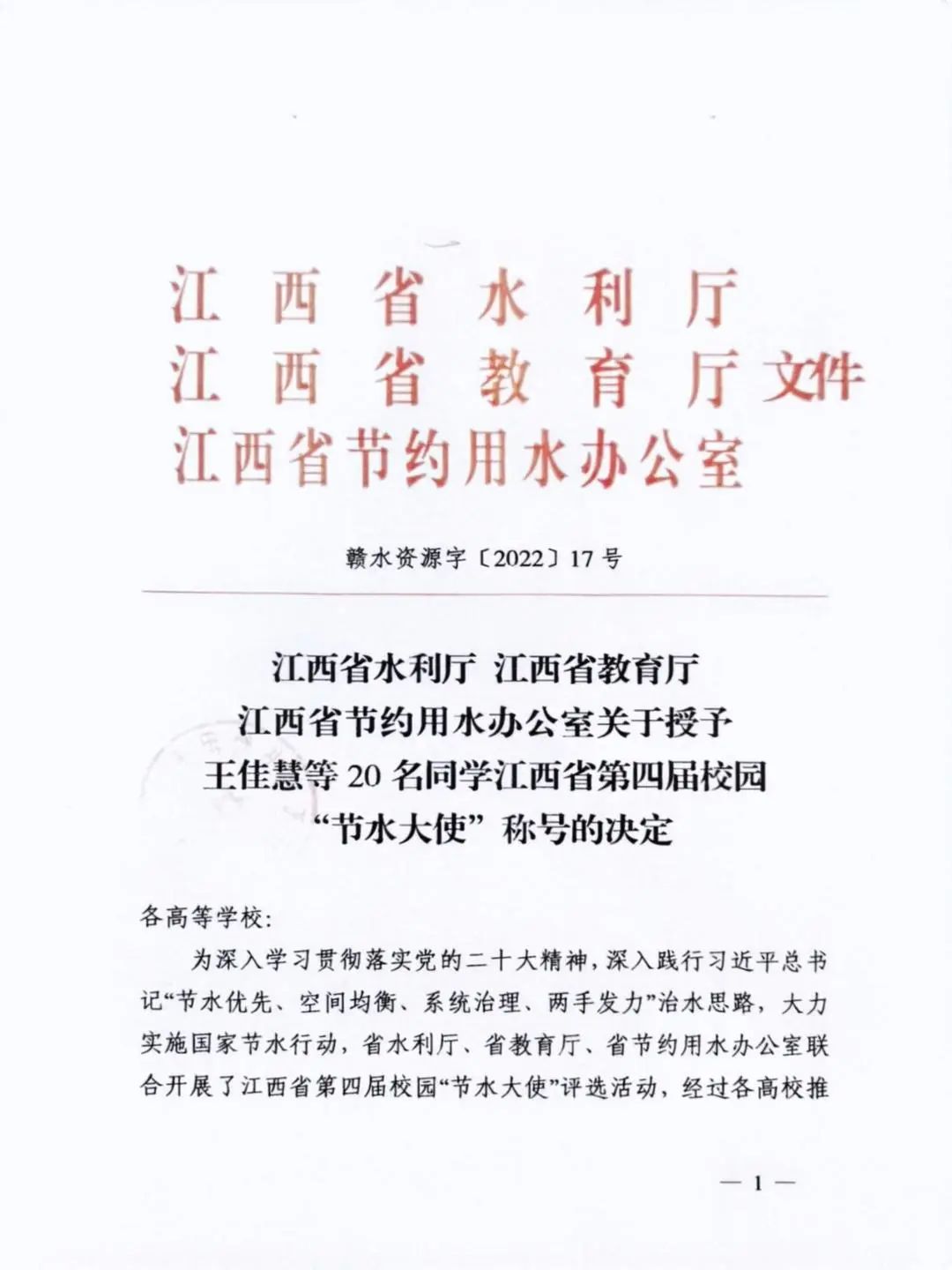 为深入学习贯彻落实党的二十大精神,深入践行习近平总书记“节水优先、空间均衡、系统治理、两手发力”治水思路,大力实施国家节水行动,江西省水利厅、江西省教育厅、江西省节约用水办公室联合开展了江西省第四届校园“节水大使”评选活动,教育引导广大师生树立“爱水、护水、节水、惜水”意识,营造浓厚校园节水氛围,以校园影响家庭、辐射社会,掀起节约集约用水和生态文明建设的热潮。本次活动吸引了全省高校大学生参与,经全省各高校推荐、专家审核、公共网络票选等程序,我院物联网工程专业李宁同学荣获江西省第四届校园“节水大使”荣誉称号。