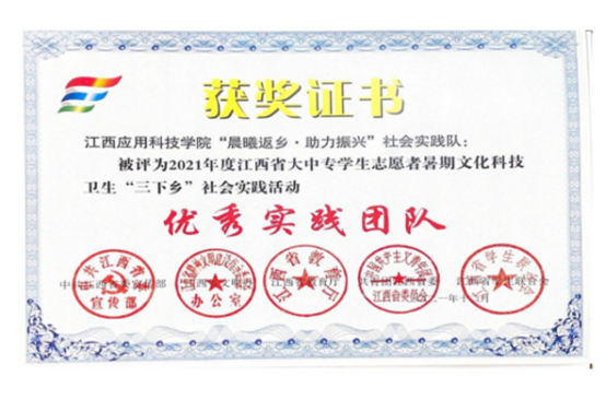 根据江西省学生联合会《2021年度江西省大中专学生社会实践活动总结通报结果公示》,我院“晨曦返乡•助力振兴”三下乡社会实践队”实践团荣获2021年江西省大中专学生志愿者暑期“三下乡”社会实践活动优秀团队。
