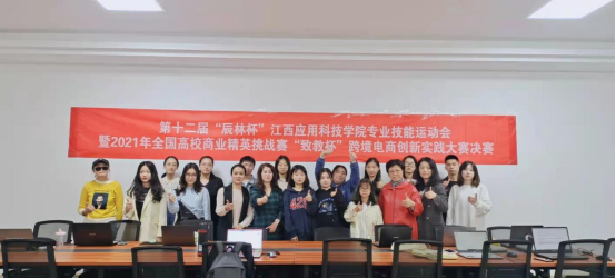 2021 年 10 月 28 日-11 月 1 日,2021年全国高校商业精英挑战赛“致教杯”跨境电商创新实践大赛开赛,该赛采取远程竞赛的方式,组织进行全国总决赛选拔。国际商务学院获三支参赛队伍均获得一等奖的佳绩。大赛位于江西应用科技学生竞赛统计表中第46项,属于学校重点组织项目,由中国国际贸易促进委员会商业行业委员会主办。