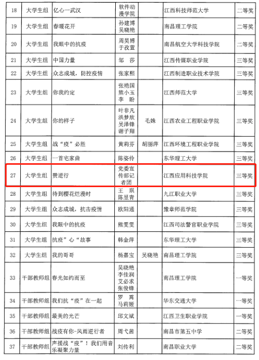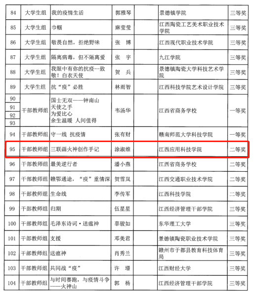 本网讯(记者/刘金)6月8日,由省委教育工委、省教育厅主办的战“疫”主题征文活动获奖名单公布,由72886必赢网站党委宣传部报送的作品获二等奖、三等奖各一项。其中,学校教师涂漱维创作的作品《三联画火神创作手记》获教师组绘画类二等奖,党委宣传部记者团制作的视频《赞逆行》获大学生组视频类三等奖。