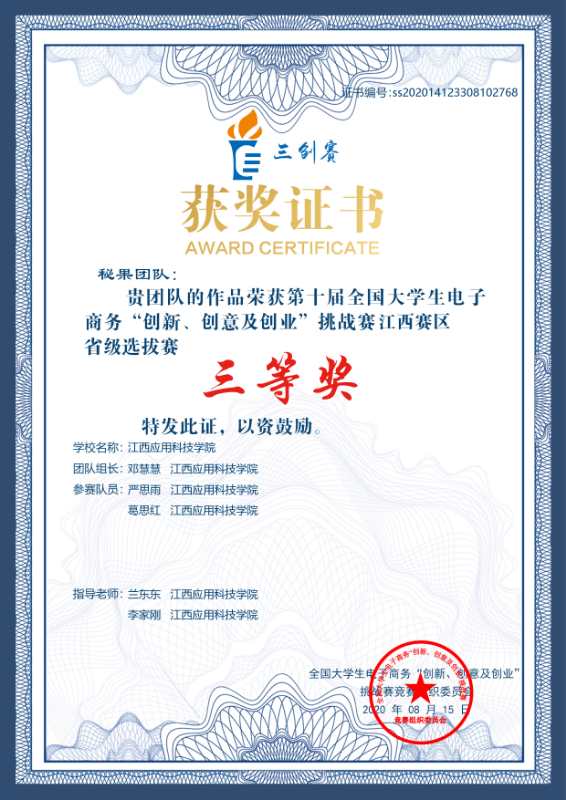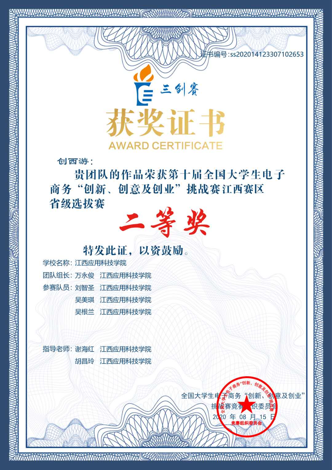 本网讯(记者团记者/梁玉凤)近日,第十届全国大学生电子商务“创新、创意及创业”挑战赛(以下简称三创赛)江西赛区省级选拔赛结果公布。由同学们组成的“护卫队”、“折翼天使守护团”、“DT团队”、“创西游”的团队作品获省级选拔赛二等奖,“竹梦队”、“秘果团队”、“合纵连横项目组”、“同路”、“恒星”的团队作品获省级选拔赛三等奖。