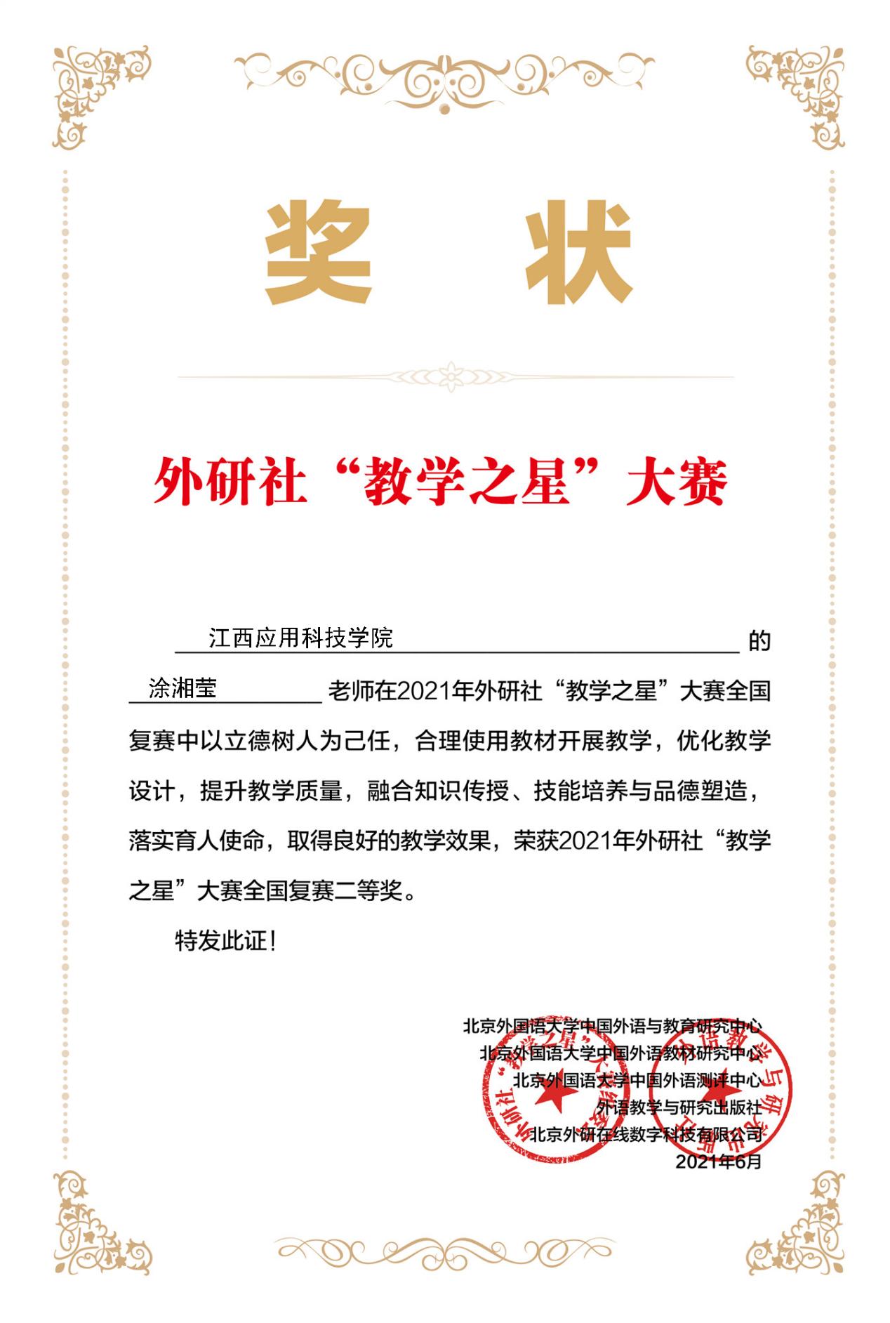 本网讯(通讯员/涂湘莹)在2021年外研社“教学之星”大赛中,必赢官网国际商务学院龙旸、徐桔林、涂湘莹、邹梦云、陈洁、饶航、林启、刘锦莲、万菲等九位老师荣获全国复赛二等奖。