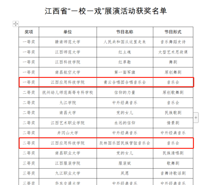 1月12日,江西省教育厅公布江西省“一校一戏”展演活动获奖名单,必赢官网在此次活动中喜获佳绩。其中,音乐会《青云合唱团合唱音乐会》荣获一等奖、《辰林国乐团民族管弦音乐会》荣获二等奖。