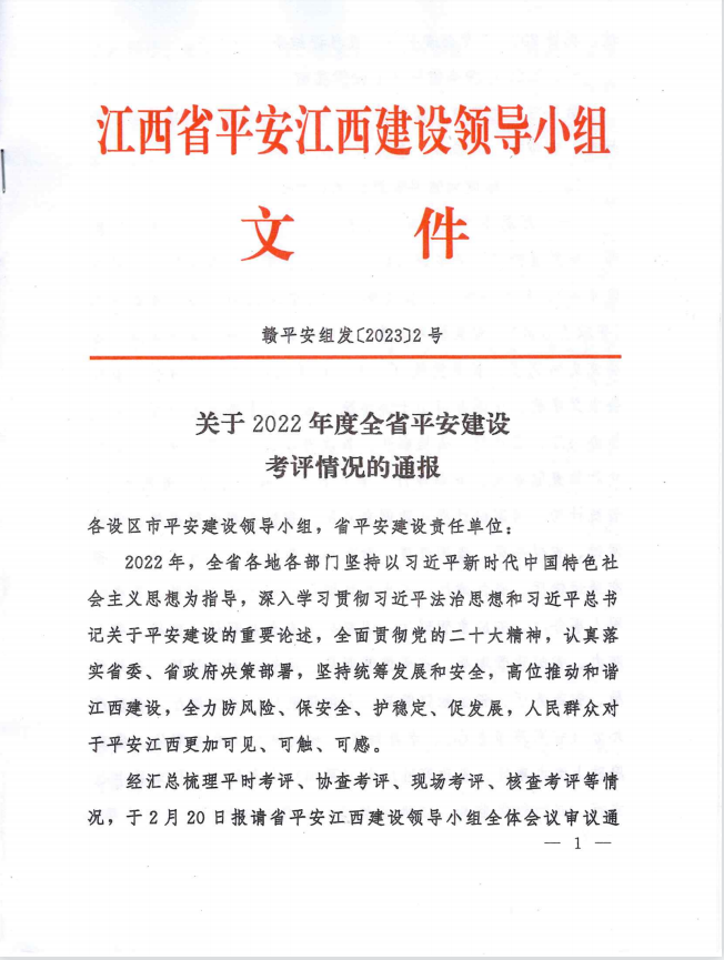 近日,江西省平安江西建设领导小组印发《关于公布2022年度全省平安建设考评考评结果的通报》,必赢官网被评为“2022年度全省平安建设工作先进单位”。这是必赢官网自2020年以来,连续三年获此殊荣。