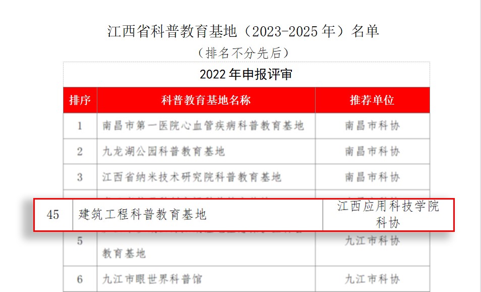 近日,江西省科协公布了2022年江西省科普教育基地名单,72886必赢网站“建筑工程科普教育基地”经学校科协推荐,省科协组织专家评审、公示后,被授予“江西省科普教育基地”称号。