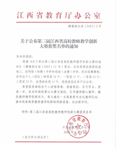 学校高度重视教学创新与课程思政教学改革。自大赛启动以来,赵磊及教师团队李文娟、陈洪波、王慧老师积极备赛,精心策划、精密组织、精准辅导,科学制定工作方案,最终在第三届江西省高校教师教学创新大赛脱颖而出。