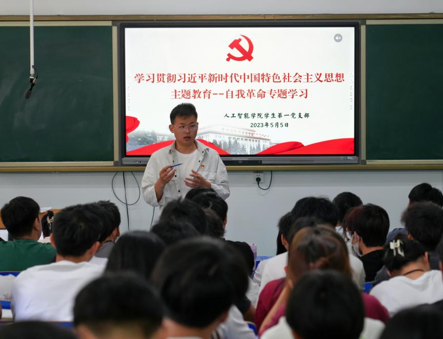 为深入学习领会习近平总书记关于党的自我革命重要论述的丰富内涵和重大意义,2023年5月5日,人工智能学院学生党支部三达楼阶梯九教室展开了论党的自我革命专题学习交流会。