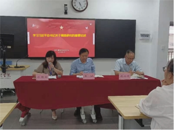 谢远健以毛泽东同志的《湖南农民运动考察报告》和《寻乌调查》在中国革命中的重要作用,作为我院深入学习贯彻习近平总书记关于调查研究的重要论述的切入点。他表示调查研究对于各高校、社会及国家均有重要作用,是我们党一直以来的工作作风。调查研究即人们深入现场进行考察,以探求客观事物的真相、性质和发展规律的活动,是人们认识社会、改造社会的一种科学方法。调查是研究的前提和基础,研究是调查的发展和深化。