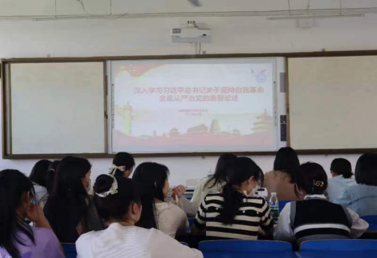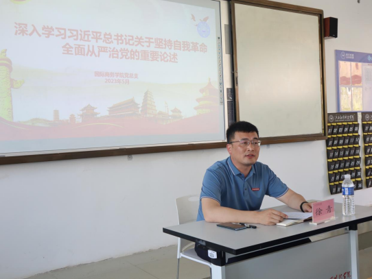 5月5日下午,国际商务学院党总支组织全体党员在三达楼204教室深入学习领会习近平总书记关于坚持自我革命全面从严治党的重要论述,持续深入学习习近平新时代中国特色社会主义思想,深入学习宣传贯彻党的二十大精神。党总支书记徐青参加会议并作交流发言。
