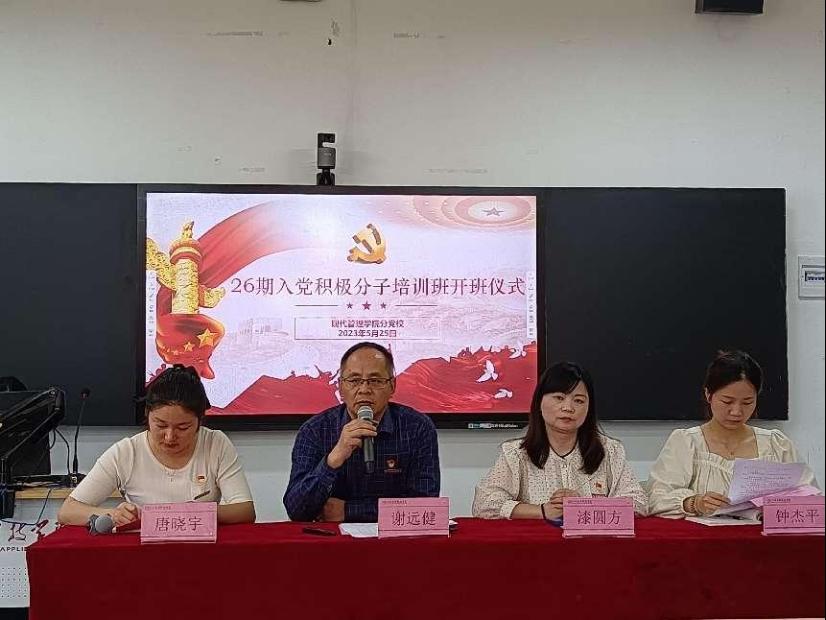 5月26日,现代管理学院分党校第26期入党积极分子培训班开班仪式顺利举行。出席开班仪式的有:学院党总支委员、院长谢远健,教工支部书记、副院长漆圆方,党总支专职组织员唐晓宇,学生党支部书记钟杰平。学院党总支委员、各支部委员、机关党总支入党积极分子以及学院入党积极分子参加了开班仪式,仪式由唐晓宇主持。