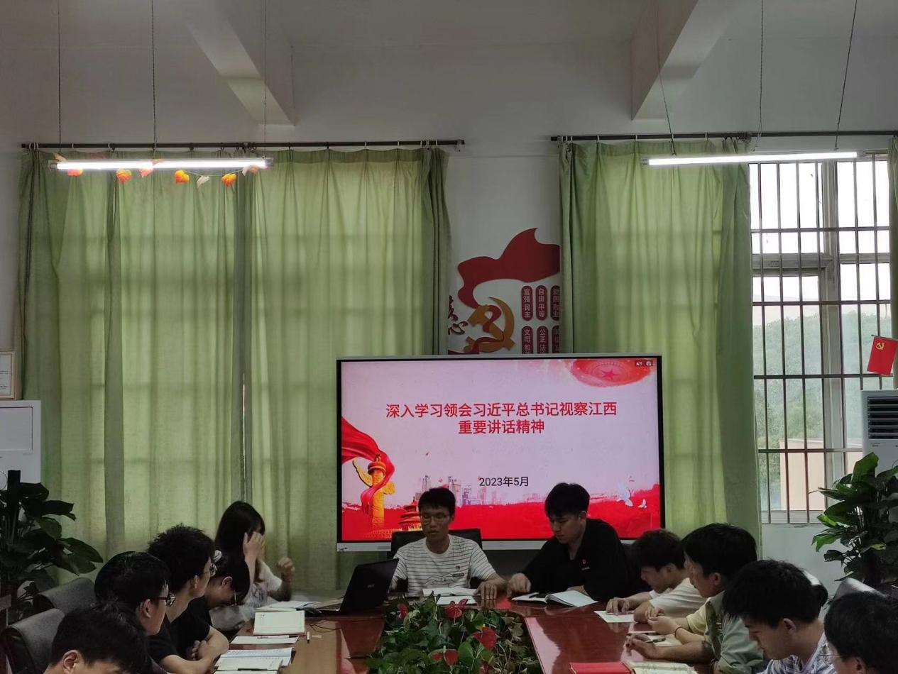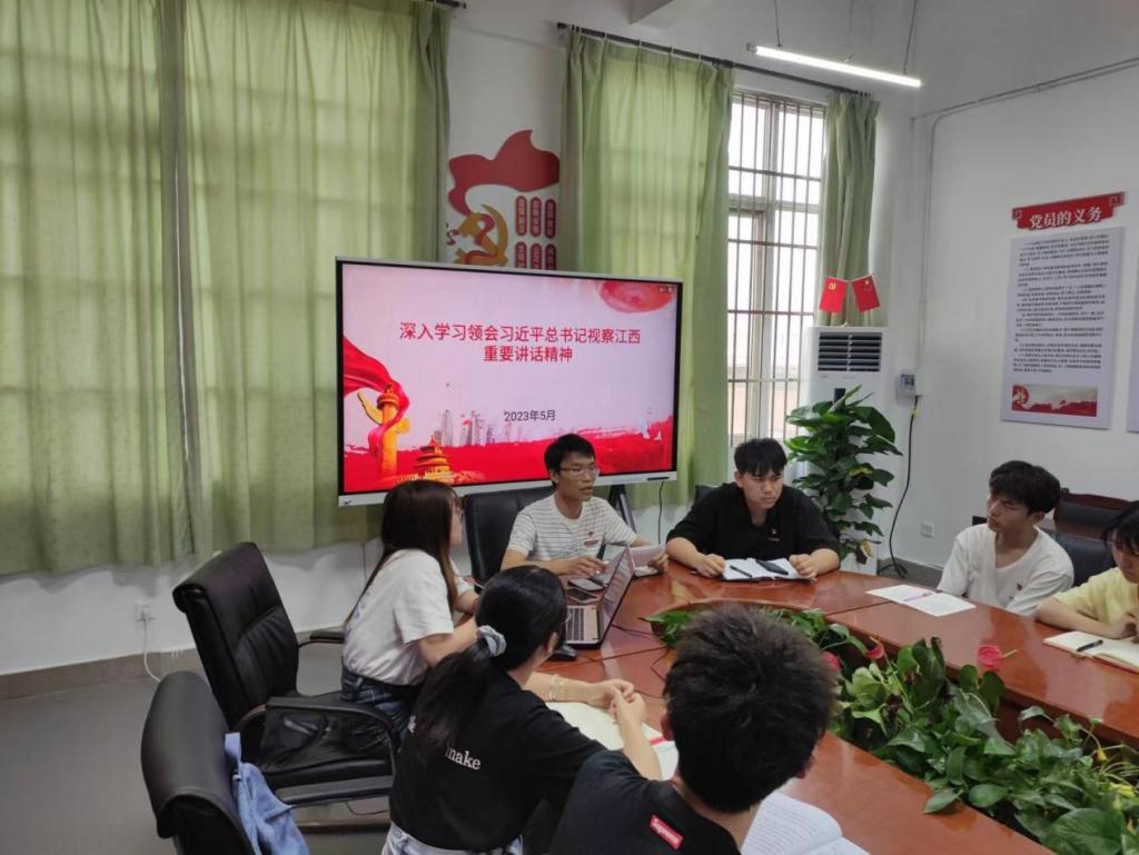 最后学生党支部书记总结发言到:习近平总书记视察江西重要讲话精神,鲜明宣示省委高举习近平新时代中国特色社会主义思想伟大旗帜,一以贯之、不折不扣地贯彻落实习近平总书记视察江西重要讲话精神的政治态度,每位党员同志要始终坚持以习近平新时代中国特色社会主义思想为指导,持续深入贯彻习近平总书记视察江西重要讲话精神进一步强化使命担当、狠抓工作落实,坚定不移沿着习近平总书记指引的道路奋勇前进,一步一个脚印把总书记为江西擘画的蓝图变为美好现实。