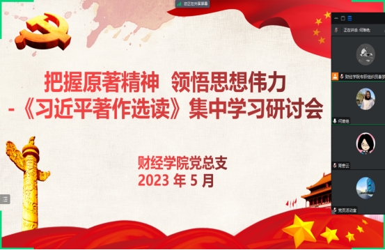 为深入开展学习贯彻习近平新时代中国特色社会主义思想主题教育的指示精神和要求,5月30日下午,财经学院党总支于综合大楼211党员活动室结合腾讯会议,开展学习“把握原著精神,领悟思想伟力”—《习近平著作选读》集中学习研讨会。参加此次会议的有校党委委员、副校长胥懋云、财经学院党总支书记何难绝、财经学院院长揭志锋以及财经学院全体师生党员。