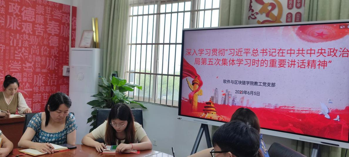 6月5日下午,软件与区块链学院教工党支部在三达楼210召开理论学习会议,会议内容围绕深入学习贯彻“习近平总书记在中共中央政治局第五次集体学习时的重要讲话精神”展开,进一步深刻认识教育的基础性、先导性、全局性地位和作用,深刻领悟作为教师的职责和使命,会议由教工党支部书记卞秀运主持,全体教职工参加此次会议。