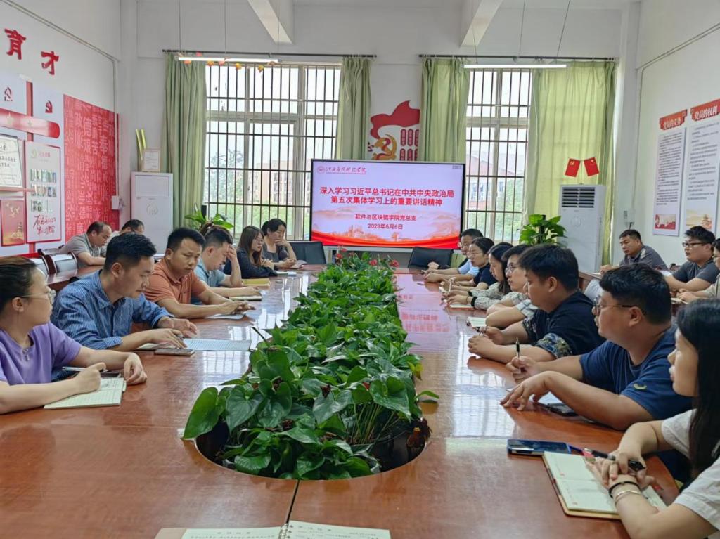 6月6日,为深入学习习近平总书记在中共中央政治局第五次集体学习上的重要讲话精神,软件与区块链学院党总支三达楼210党员活动室召开专题学习会议,会议由学院党总支书记卢胜勇主持,党总支委员会委员、各党支部书记以及学院全体教职员工参加此次会议。
